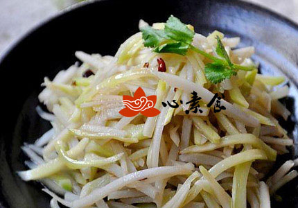 2、藕丝切好后,用清水泡一泡,漂洗两遍,既能洗去多余的淀粉,使藕丝口感更脆,也能防止藕丝氧化变黑;
