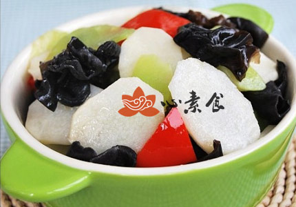 2、木耳提前泡发,撕成小块,入沸水中快速焯一下。