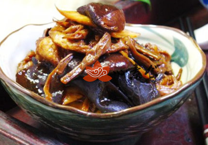 5、坐锅热油,放香菇、茭白、黄花菜,炒至茭白软放面筋翻炒。 6、再放黑木耳翻炒,倒入红烧汁,炒均匀,加适量清水,大火烧开转小火。