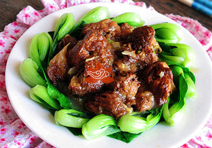 8、将烧好的猴头菇倒入带有油菜的盘中即可。[XinSuShi.com]
