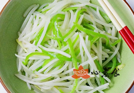 1、绿豆芽清水浸泡洗净,择去头尾;尖椒洗净切丝。