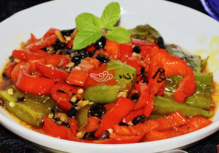 4、锅里留油将姜丝、豆鼓爆香,将青红椒倒入翻炒。