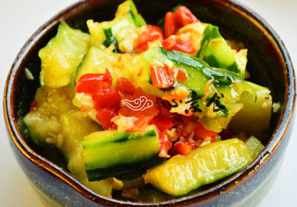 1、黄瓜洗净拍碎,斜片成段,装入拌盆。