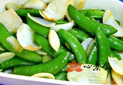 6、放甜豆、适量盐、糖、生抽翻炒。
