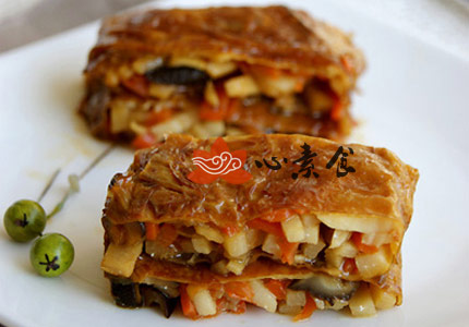 11、蒸好的素鸭放在煎锅中煎得凉面焦黄。注意:豆皮比较容易糊,火要调小。