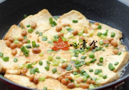 2、锅内倒油烧热,先将豆腐一面中火煎黄,小心翻一面略微煎煎。