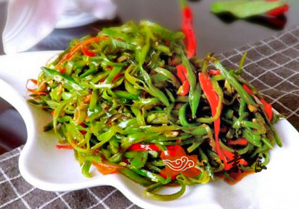 1、将扁豆两边的老筋撕掉,洗净切丝。