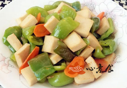 1、千页豆腐、青椒洗净切块,胡萝卜洗净切片。