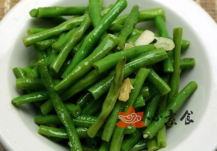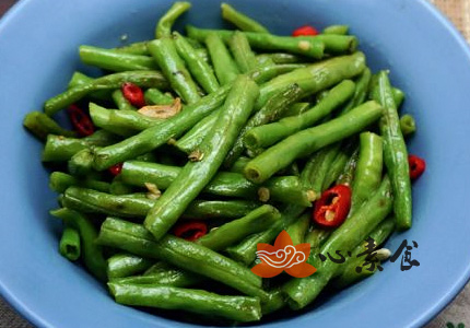 4、加盐炒至均匀挂味后,先盛部分豇豆装盘。