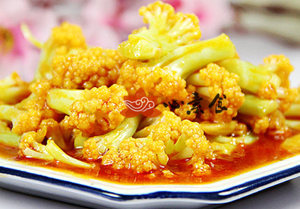 2、有机菜花洗净掰成小朵,开水焯至五成熟。