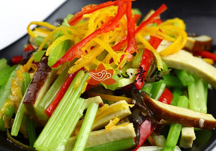 5、炒锅放焯熟的香芹、豆腐干、木耳煸炒,放食盐、蘑菇精、生抽,约1分钟水淀粉勾芡即可出锅。[XinSuShi.com]