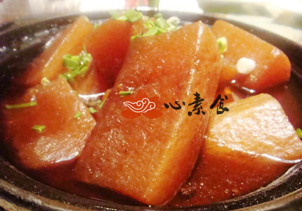 3、倒入萝卜翻炒一会,加酱油、素蚝油、白糖略略翻炒。
