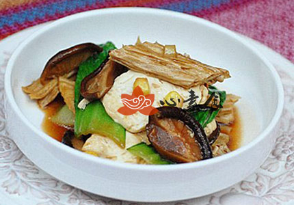 9、下香菇和腐竹翻炒加入生抽、素蚝油、白糖、盐。