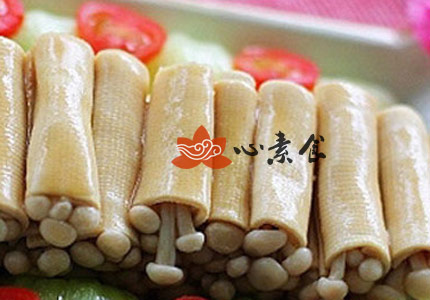 2、卷好金针菇后在封口处加点生粉以便能固定住。