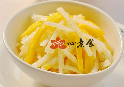 1、梨去皮,切丝;芒果取果肉,切丝。