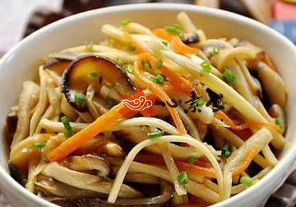 1、茭白切丝;胡萝卜去皮切丝;香菇泡透后去蒂切丝。