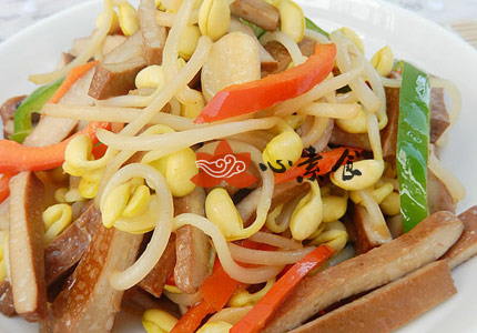 1、黄豆芽择洗干净,尖椒切丝,香干切丝。