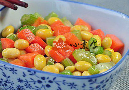 3、炒锅烧热,倒油,依次放入胡萝卜、芹菜、煮熟的黄豆,