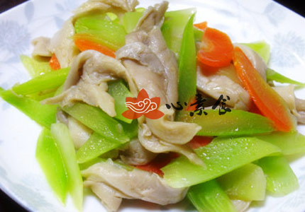 4、另起油锅,放莴苣和胡萝卜稍炒,放少许盐。