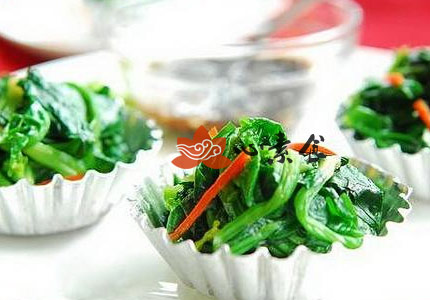 3、将菠菜捏成团,同红椒丝一同放入器皿中,蒸3分钟即可。