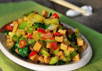 4、五香豆腐干切成小丁,红椒横切成小圈。