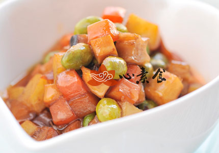6、放入豆干煸炒1分钟,再放入土豆丁,莲藕丁,冬笋丁,荸荠丁,胡萝卜丁,毛豆,和香菇丁翻炒约2分钟。