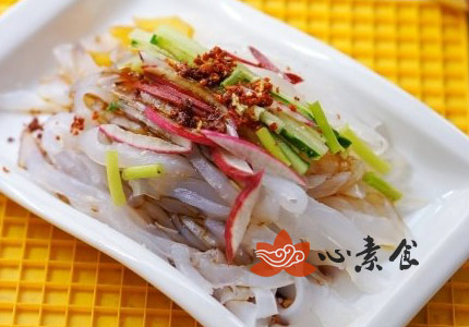 9、在凉皮条上面铺好黄瓜,榨菜,樱桃萝卜。