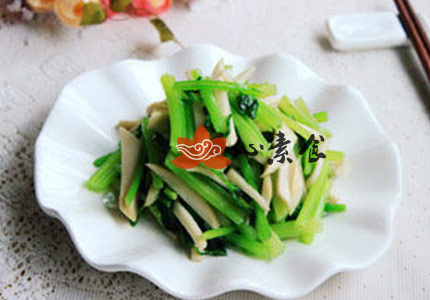 3、再放入芹菜、盐、蘑菇精翻炒。