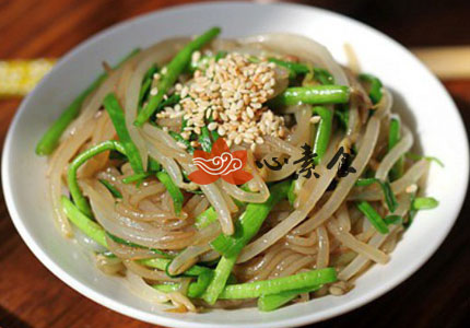 2、豆芽菜洗干净、青蒜切成和豆芽一样长的段。