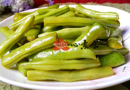 4、将焯水后的四季豆放入锅里略翻炒。