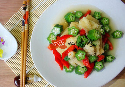 6、红椒和秋葵一起倒入锅内,少许植物油翻炒片刻,秋葵已经汆烫过,翻炒时间不可过长。