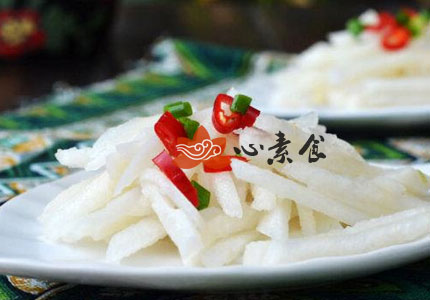 4、金秋梨去皮切成细丝,加入到莲藕丝中,再加适量醋拌匀