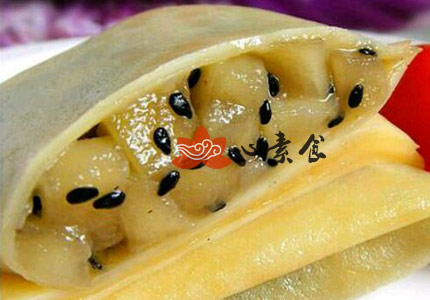 9、然后从没有苹果的那头掀起,盖在有苹果的这一半蛋皮上。[sushi.laoyanhuo.com]