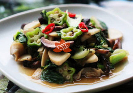 4、再将油菜、秋葵、红椒投入合炒,加一点水,加适量盐、糖。