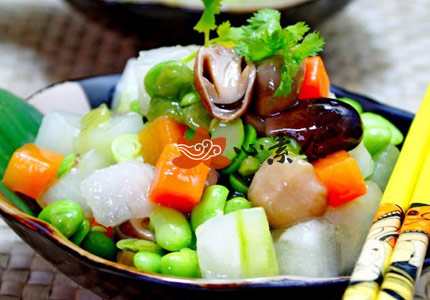 6、加胡萝卜继续煸炒,炒致冬瓜呈半透明状,放入草菇及毛豆继续翻炒