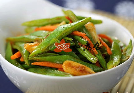 4、放入胡萝卜丝翻炒约1分钟,将刀豆丝倒入一起翻炒