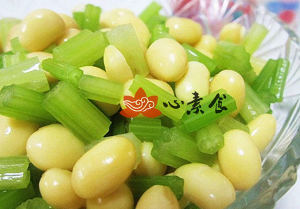 1、黄豆提前12小时泡发;芹菜洗净,切段过开水焯一下,取出放凉水中待用。