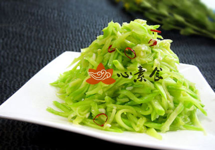 1、嫩南瓜洗净去蒂、软肉层的瓜瓤用勺片除,切成条丝状。