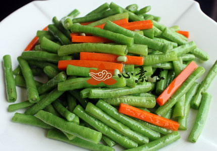 3、锅中放油,油热后,放入姜丝,倒入豇豆角、胡萝卜条。
